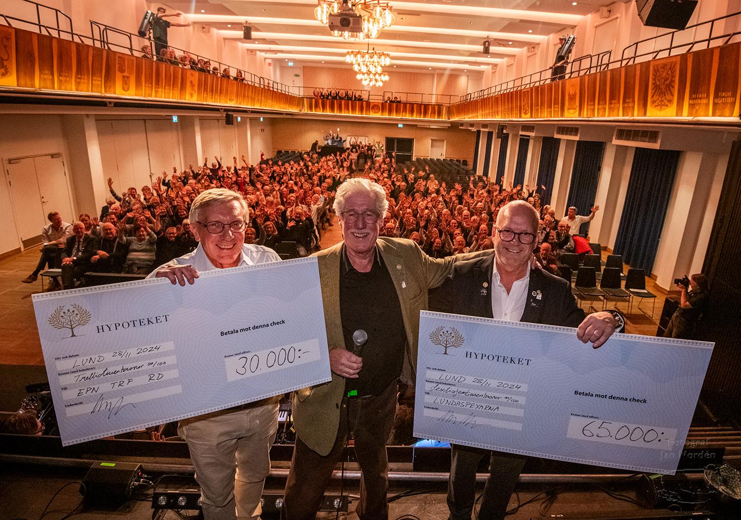 Vinnarna i årets Spex, är de som står på checkarna, som fr.v. Stefan Knutsson håller: End Polio Now (EPN), The Rotary Foundation (TRF) och Rotary Doctors (RD), draghästen till spexet, Lars Bjurström och biljettenrolleraren, Michael Pantzar, som oförtrutet gjort jättejobbet att se till att det blev publik, som i sin tur var den största vinnaren.