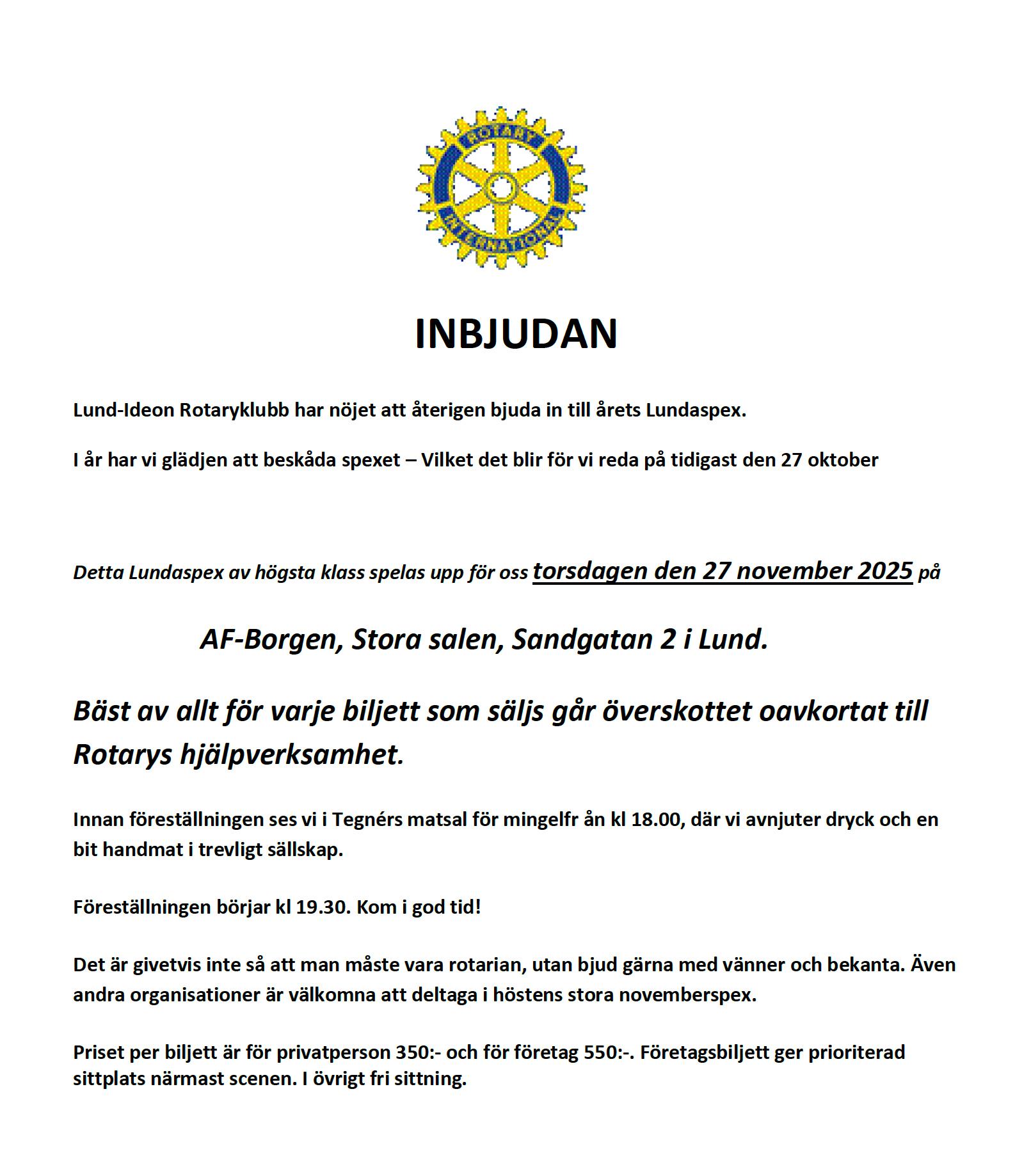 Lund-Ideon Rotaryklubb har nöjet att åter igen bjuda in till årets Lundaspex.